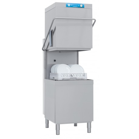 Lave-vaisselle frontal : il se charge par l’avant, comme un lave-vaisselle domestique, avec des paniers amovibles (souvent 50 × 50 cm). Il est particulièrement adapté à la petite restauration (jusqu’à 100–120 couverts), pour assiettes, tasses, ustensiles, plateaux…