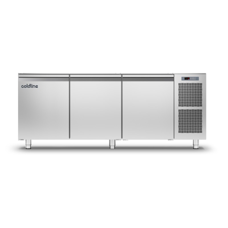 • Angles intérieurs arrondis • Plan de travail renforcé épaisseur 40 mm avec bords arrondis • Évaporateur ventilé • Pieds inox réglables en hauteur • Portes avec maintien en position ouverte à 105° • Joints de porte magnétiques facilement démontables • Groupe livré d’origine à droite, positionnable sur demande à gauche sans supplément de prix • Emplacement du compresseur insonorisé et avec aération frontale • Groupe logé sur glissières facile à extraire • Évaporateur traité anti-corrosion • Dégivrage automatique par gaz chaud • Réévaporation automatique des condensats • Gaz réfrigérant R290 (groupe logé), R452a (sans groupe) • Thermostat électronique • Affichage digital • Alimentation 220/240 - 50Hz