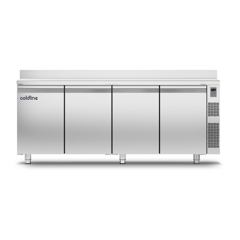 • Angles intérieurs arrondis • Plan de travail renforcé épaisseur 40 mm avec bords arrondis • Évaporateur ventilé • Pieds inox réglables en hauteur • Portes avec maintien en position ouverte à 105° • Joints de porte magnétiques facilement démontables • Évaporateur traité anti-corrosion • Dégivrage automatique par gaz chaud • Réévaporation automatique des condensats • Gaz réfrigérant R290 (groupe logé), R452a (sans groupe) • Thermostat électronique • Affichage digital • Alimentation 220/240 - 50Hz