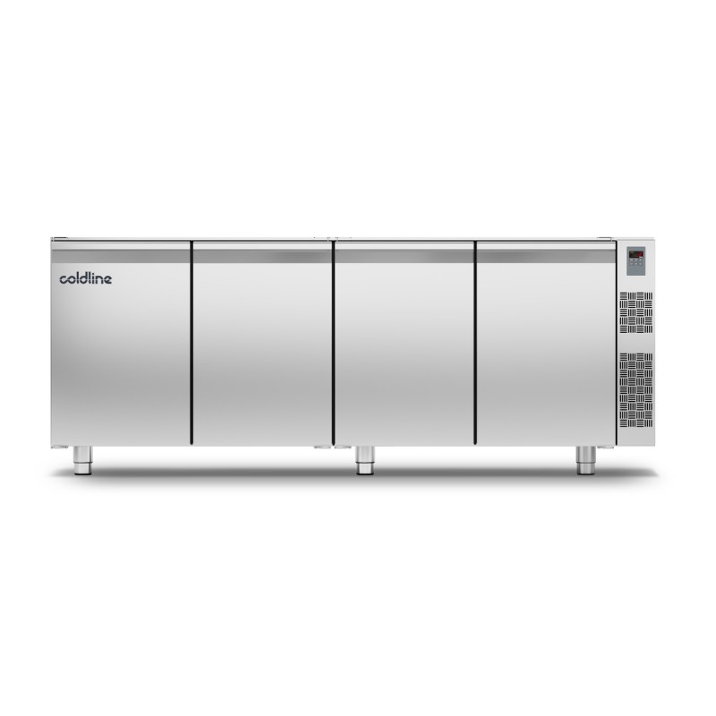 • Angles intérieurs arrondis • Plan de travail renforcé épaisseur 40 mm avec bords arrondis • Évaporateur ventilé • Pieds inox réglables en hauteur • Portes avec maintien en position ouverte à 105° • Joints de porte magnétiques facilement démontables • Groupe livré d’origine à droite, positionnable sur demande à gauche sans supplément de prix • Emplacement du compresseur insonorisé et avec aération frontale • Groupe logé sur glissières facile à extraire • Évaporateur traité anti-corrosion • Dégivrage automatique par gaz chaud • Réévaporation automatique des condensats • Gaz réfrigérant R290 (groupe logé), R452a (sans groupe) • Thermostat électronique • Affichage digital • Alimentation 220/240 - 50Hz
