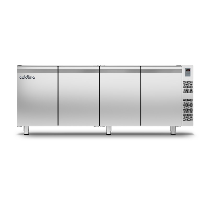 • Angles intérieurs arrondis • Plan de travail renforcé épaisseur 40 mm avec bords arrondis • Évaporateur ventilé • Pieds inox réglables en hauteur • Portes avec maintien en position ouverte à 105° • Joints de porte magnétiques facilement démontables • Évaporateur traité anti-corrosion • Dégivrage automatique par gaz chaud • Réévaporation automatique des condensats • Gaz réfrigérant R290 (groupe logé), R452a (sans groupe) • Thermostat électronique • Affichage digital • Alimentation 220/240 - 50Hz