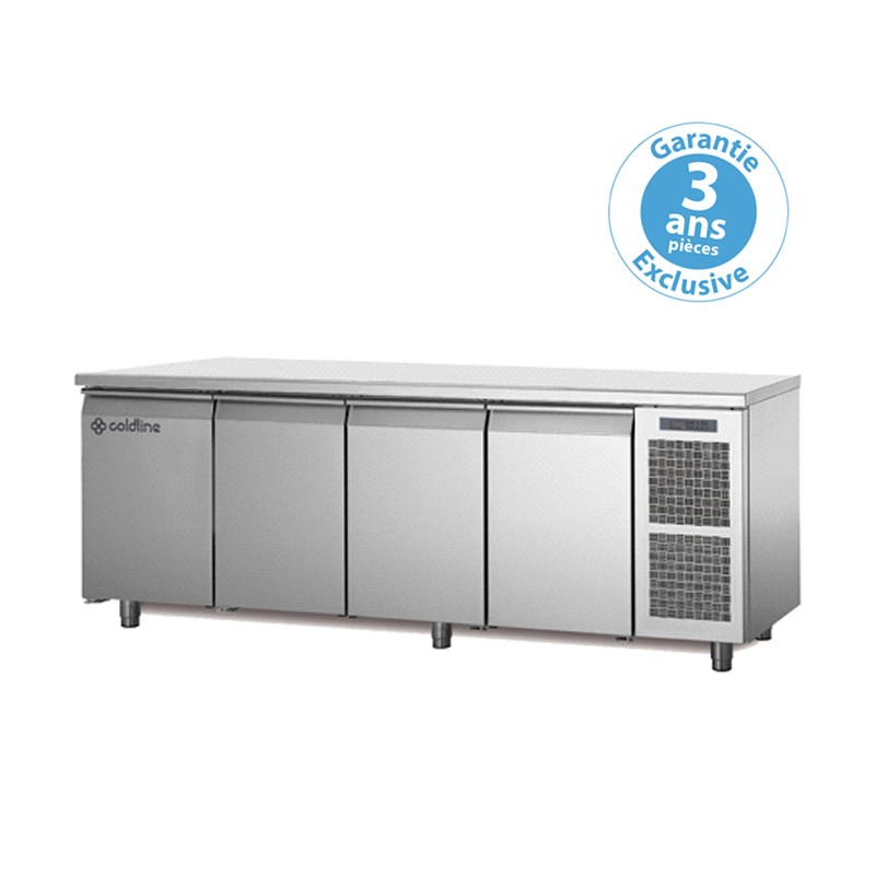 Cette table réfrigérée négative -2°C +8°C de COLDLINE en construction MONOCOQUE tout inox 18/10 arrière et dessous compris dispose d'un volume de 560 litres, d'un groupe logé à gauche ou à droite, d'angles internes arrondis, d'un groupe tropicalisé ambiance +43°C, d'un tableau de commandes à gauche ou à droite, d'un évaporateur ventilé, d'un plan de travail renforcé épaisseur 40 mm avec bords arrondis, de pieds réglables en hauteur, de 4 portes avec maintien en position ouverte à 105°, de joints de portes magnétiques facilement démontables, d'un évaporateur traité anti-corrosion, du dégivrage automatique par gaz chaud et réévaporation automatique des condensats, d'un thermostat électronique et d'un affichage digital. Isolation 60 mm sans CFC. Alimentation : 230 V. Gaz réfrigérant : R404a.